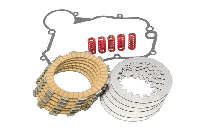 6x frictieschijven, 5x gladde schijven, 5x koppelingsveren (Sterk), 1x koppeling Koppelingsdeksel pakking, 1x sticker KRM Pro Ride De KRM koppelingsets zijn van zeer hoge kwaliteit en specifiek ontworpen voor gebruik in race-/high-end blokken met hogere pk's. Deze koppeling heeft zich al meerdere malen bewezen door met gemak 32 PK vast te houden met de door ons opgebouwde motorblokken.