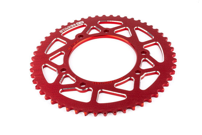 Bij het ontwerpen van de tandwielen heeft Stage6 veel aandacht besteed aan een hoge duurzaamheid, een opvallend design én een efficiënte krachtoverbrenging. Dankzij het gebruik van aluminium zijn de tandwielen ongeveer 40% lichter dan vergelijkbare stalen exemplaren. Dit vermindert het gewicht en de belasting op de achterbrug en de as, wat vooral in racesituaties een aanzienlijk voordeel kan opleveren. Bovendien zorgt de CNC-bewerking voor een zeer nauwkeurige vertanding, wat de prestaties verder verbetert ten opzichte van standaard stalen tandwielen.