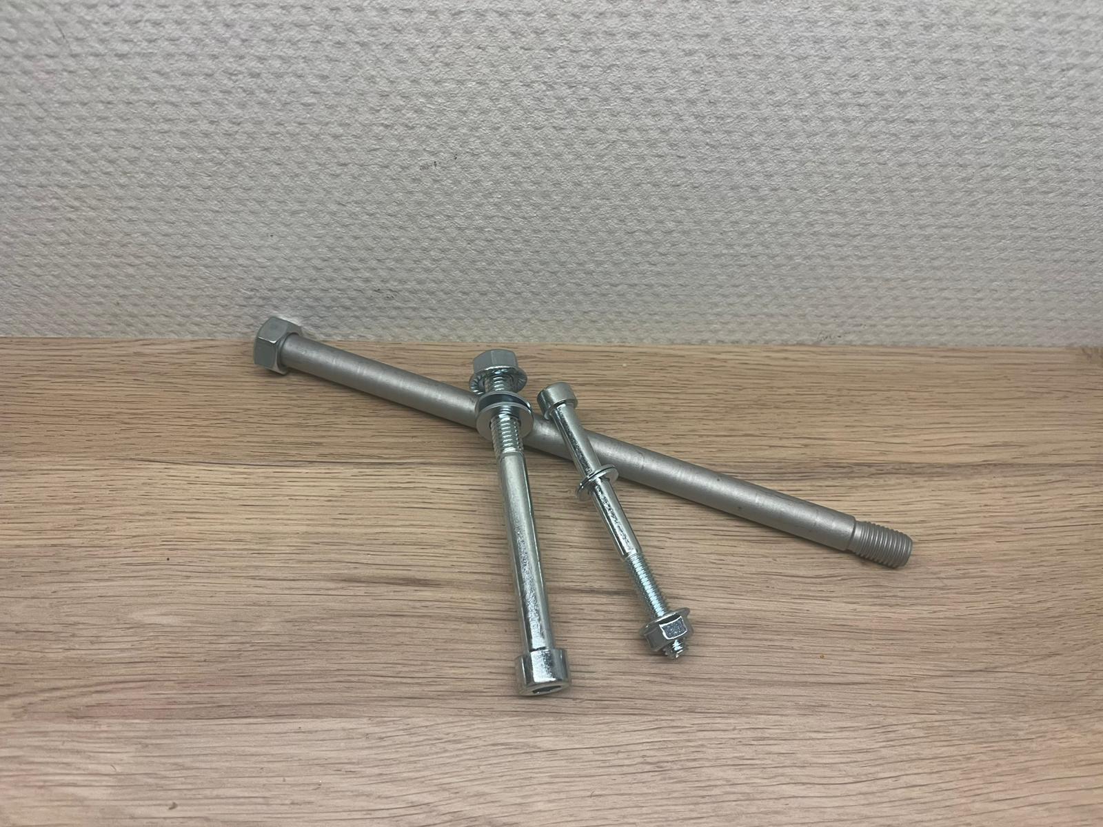 In de set zitten 2 blokbouten samen met bij behorende ringen en een gekartelde flensmoer. Verder zit de originele 12mm achterbrug as er ook bij. zo heb je alle blokbouten weer beter dan nieuw.