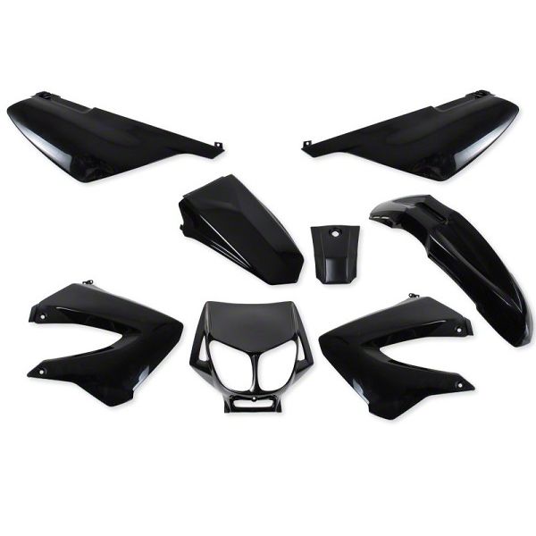 8 Delige kappenset voor Derbi Senda Xtreme van 2000 tot 2012 in de kleur zwart. volledig complete kappenset dus met tankkapje en booskijker kap.