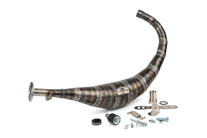 KRM Pro Ride uit Frankrijk heeft jarenlange ervaring in het ontwikkelen van tuning onderdelen en bracht in 2018 een eigen lijn hoogwaardige uitlaten op de markt. Dit is één van hun topmodellen: de KRM Pro Ride 50cc uitlaat voor Minarelli AM6.