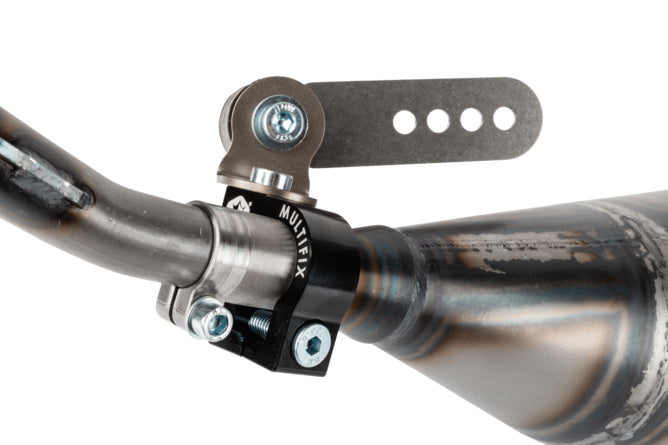 KRM heeft een behoorlijk ingenieus montagesysteem ontwikkeld voor hun systemen, het zogenaamde Multifix uitlaatbeugelsysteem. Door de jaren heen bleek dat het bevestigen van uitlaten aan de steeds veranderende frames van nieuwe modellen die op de markt komen veel problemen met zich meebrengt. Dit verstelbare montagesysteem maakt het mogelijk om de uitlaat veilig aan veel verschillende modellen te bevestigen; bovendien is de klem voor de demper niet langer nodig.