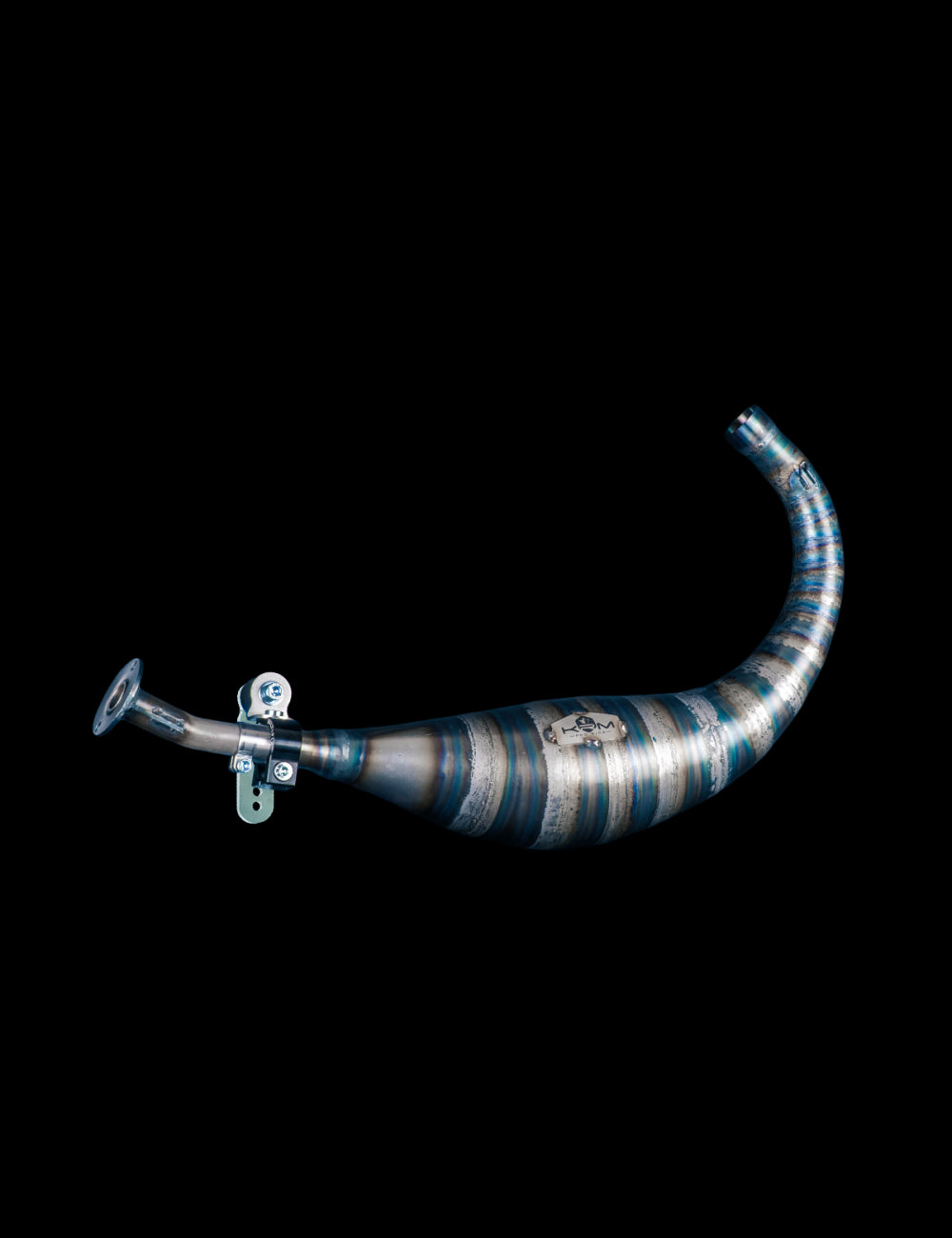 De KRM 86–95cc uitlaat bestaat uit 15 afzonderlijke segmenten, gemaakt uit 0,8 mm staalplaat. Elk onderdeel wordt volledig met de hand gerold, autogeen gelast en daarna handmatig gevormd in de KRM werkplaats. Het resultaat is een uitzonderlijk krachtige uitlaat, ontworpen voor grote setups zoals 86cc Top Performances, 86cc Most of 88cc Stage6.