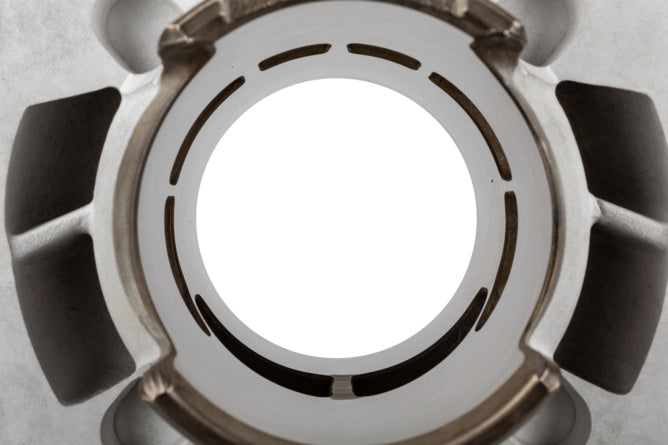 Aluminium cilinder met een boring van 47,6 mm, voorzien van 6 spoelpoorten en een gedeelde uitlaat