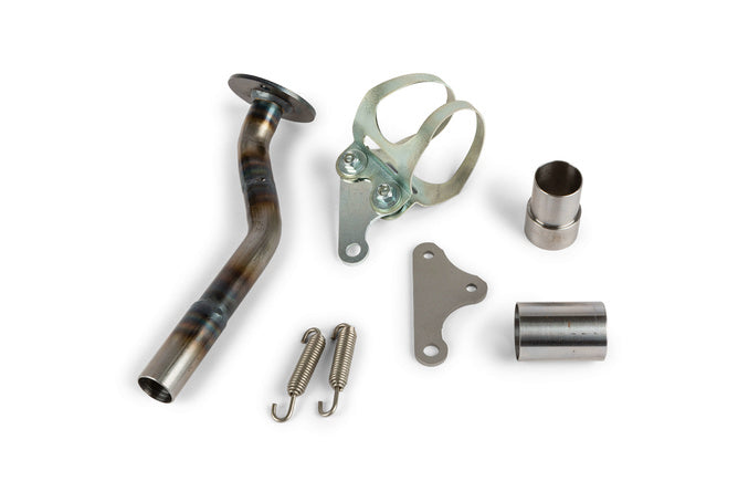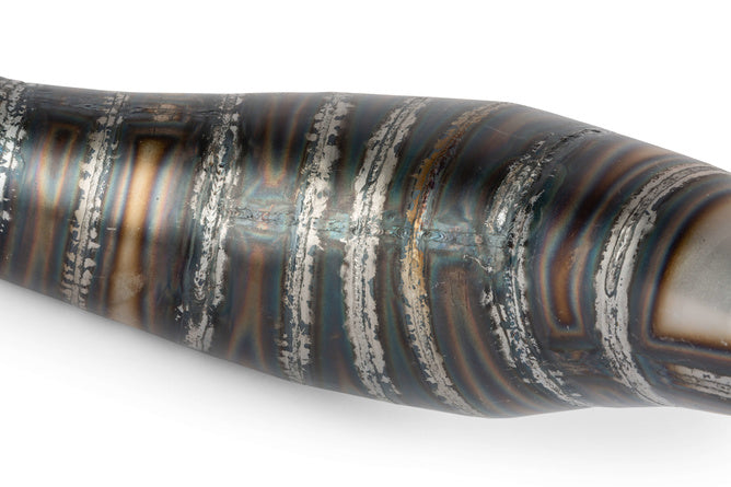 De uitlaat is een high mount model die aan de rechterzijde gemonteerd wordt. De expansiekamer is met de hand gemaakt uit meerdere segmenten plaatstaal. Let op: deze race-uitlaat wordt geleverd met een zogenaamde racing finish — dat betekent niet gelakt of gecoat. Om roestvorming te voorkomen, raden we aan om de uitlaat regelmatig in te sprayen met een beschermende olie of smeermiddel.