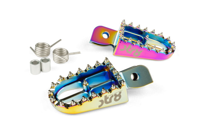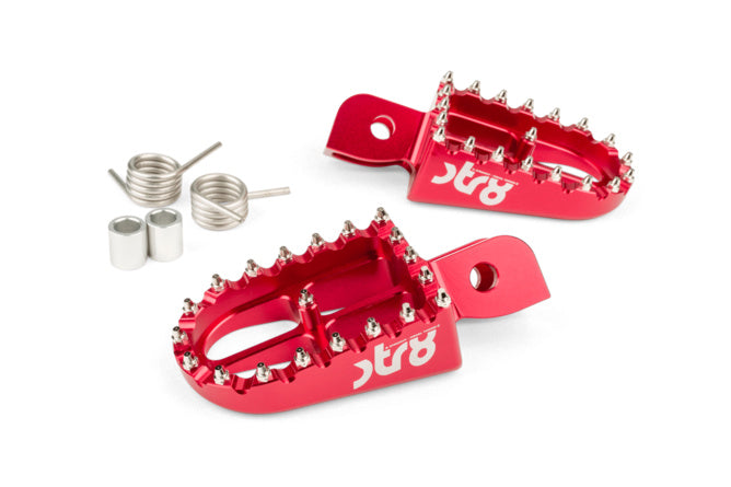 De voetsteunen passen plug & play op alle Beta RR Enduro en Supermotard 50cc-modellen. Dankzij de scherpe cross-stijl tanden bieden ze aanzienlijk meer grip en stabiliteit dan de originele steunen (ideaal als je sportief rijdt of bij offroad-gebruik)
